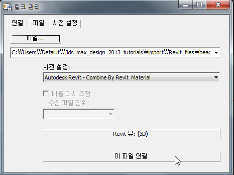 연결 탭에서 파일을 클릭합니다. 3ds Max에 파일 대화상자가 열립니다.
