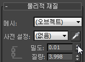수정 패널에서 물리적 재질 롤아웃으로 이동하여 밀도 값을 조정합니다. 이 작업을 수행하는 가장 간단한 방법은 스피너를 마우스 오른쪽 버튼으로 클릭하는 것입니다.