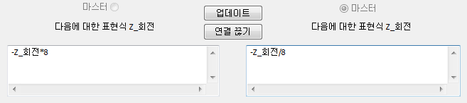 빼기 기호(-) 연산자를 사용하면 두 회전이 정렬되고, *8 및 /8 요소를 사용하면 왼쪽 앞바퀴가 스티어링 휠의 회전보다 8배 적게 피벗(Z에서 회전)됩니다.