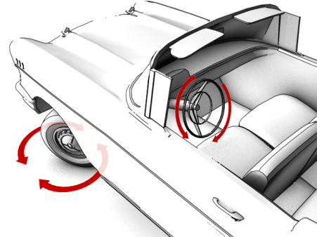 이제 자동차가 애니메이션 경로를 따라 왼쪽이나 오른쪽으로 이동할 때 앞바퀴가 피벗 또는 "회전"하도록 해야 합니다. 사실성을 더하기 위해 바퀴 피벗과 스티어링 휠 회전 간의 관계도 설정합니다.