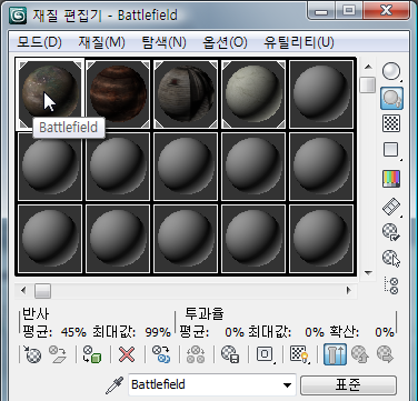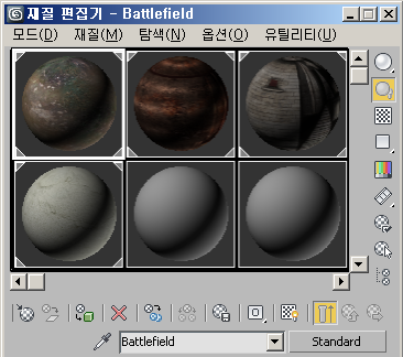 기본적으로 컴팩트 재질 편집기에는 여섯 개의 샘플 슬롯이 표시되는데 각 샘플 슬롯에는 재질이 포함될 수 있습니다. 일반적으로 여러 가지 재질에서 선택할 수 있어야 하므로 편집기에서 선택할 수 있는 샘플 슬롯 수를 늘리는 것이 좋습니다.