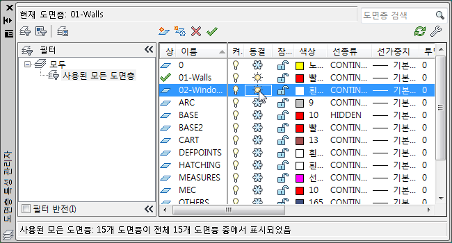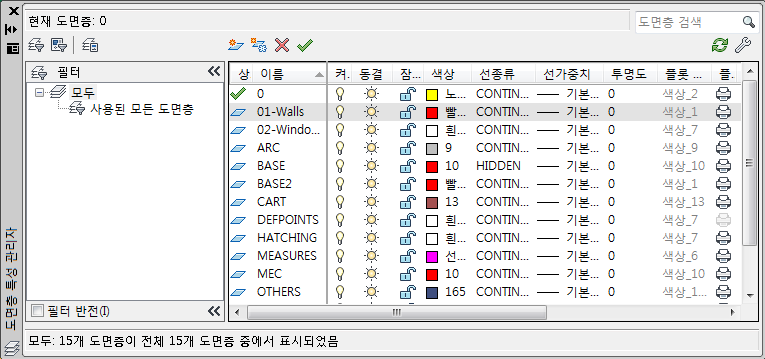 - 레이어 특성 관리자에서 01-Walls 레이어를 클릭하여 선택합니다.