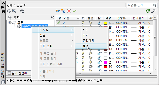 - 레이어 특성 관리자 도구 모음에서
