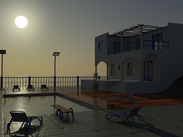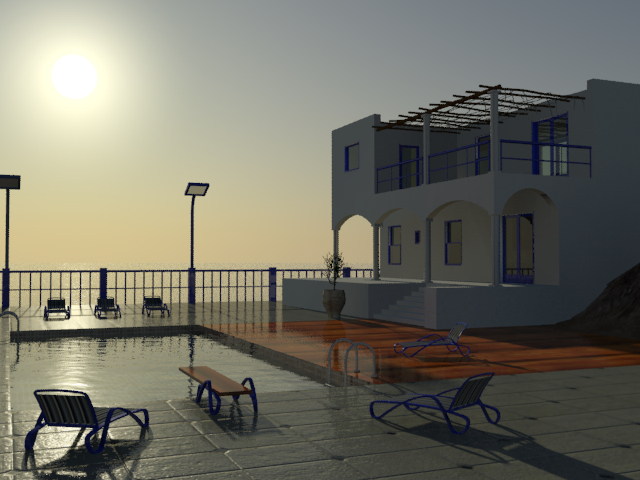 "mr 물리적 하늘 셰이더"에서는 생생한 하늘 그라데이션을 생성하여 수영장 주변의 세부 사항이 훨씬 더 분명하게 나타납니다.