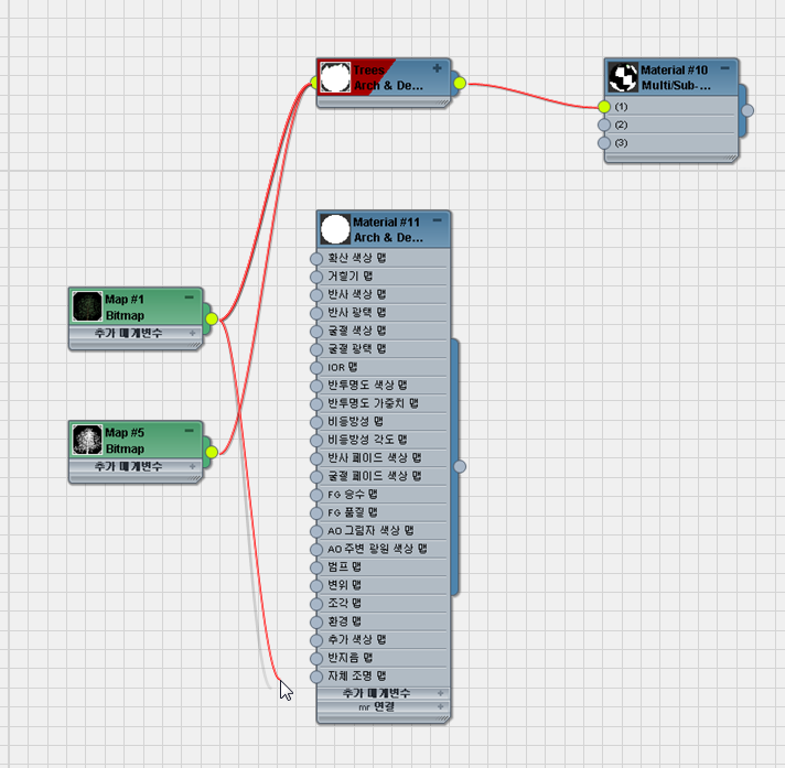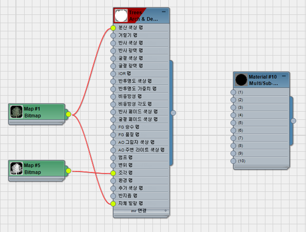 - 나무 재질 노드를 느릅나무 노드의 (1) 하위 재질 소켓에 와이어링합니다.