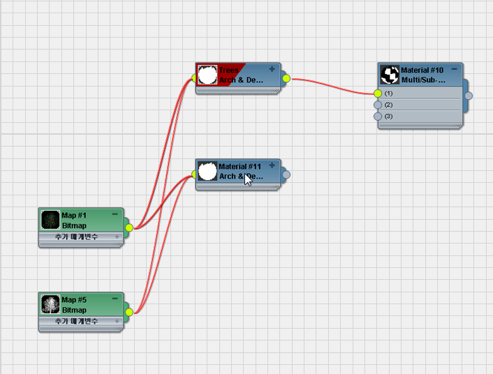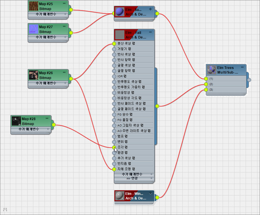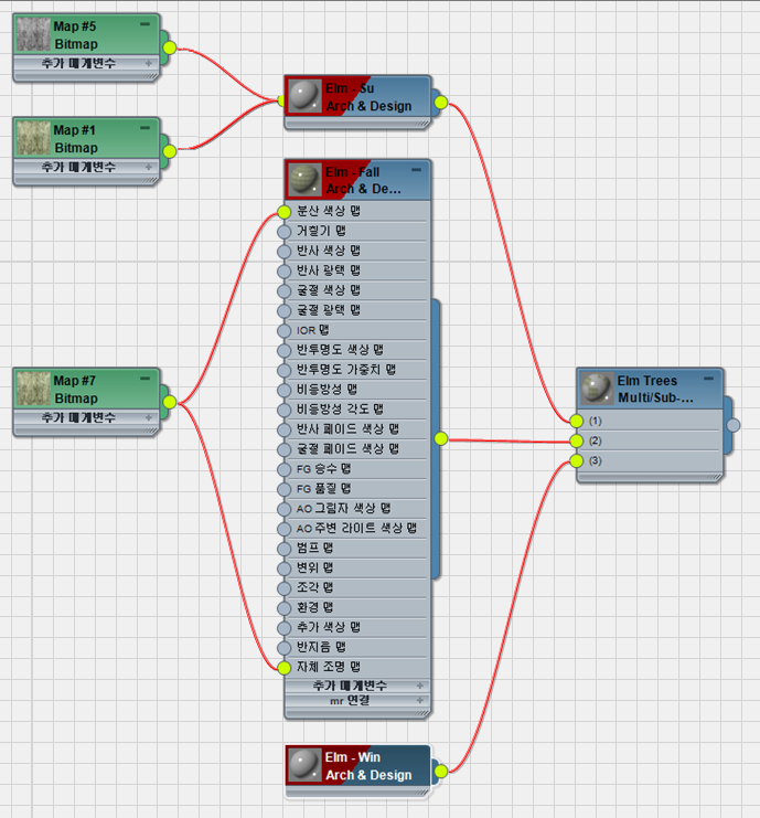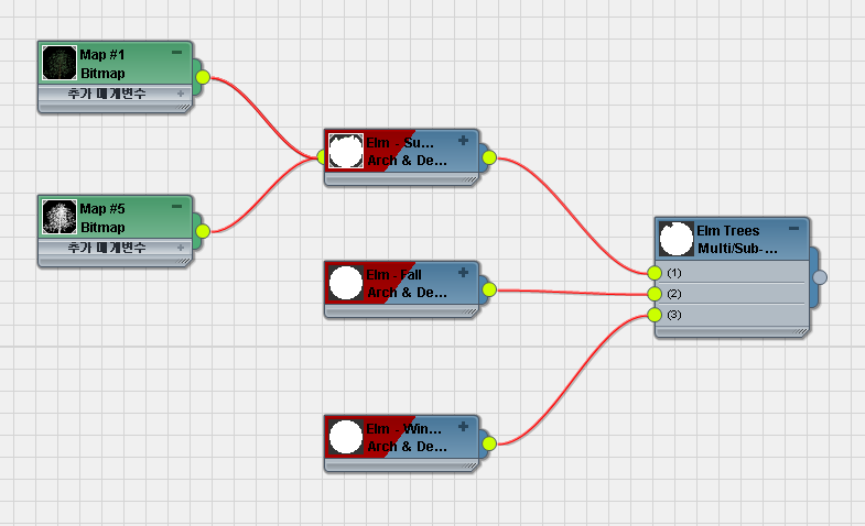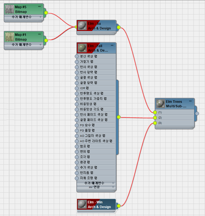 - 두 번째 및 세 번째 재질 노드를 느릅나무 재질 노드의 (2) 및 (3) 소켓에 와이어링하여 하위 재질도 되도록 합니다.