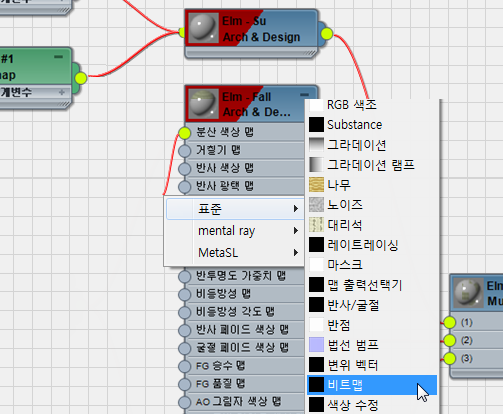 - 느릅나무 - 가을 하위 재질 노드의 분산 색상 맵 소켓에서 와이어를 드래그한 다음 마우스 버튼을 놓습니다. 팝업 메뉴에서 표준