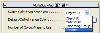 - 먼지 비트맵이 포함된 다중/하위 맵 노드를 두 번 클릭하여 해당 매개변수를 표시합니다. 다중/하위 맵 매개변수 롤아웃에서 색상/맵 전환 기준 드롭다운 리스트를 열고 임의를 선택합니다.