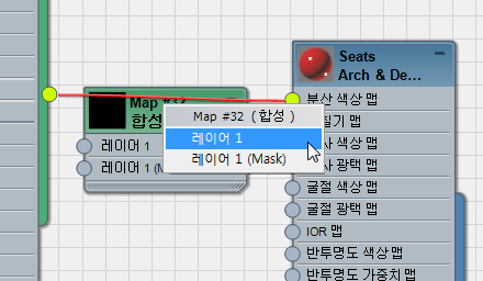 합성)을 드래그합니다. 활성 뷰에서 다중/하위 맵과 좌석 재질에 연결된 와이어에 맵을 드롭합니다. 3ds Max에 와이어에 맵을 삽입하고 있음을 보여 주는 커서가 표시됩니다. 이 커서가 표시되면 마우스를 놓습니다.