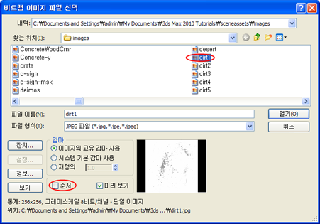 대화상자의 오른쪽 아래에 있는 축소판을 통해 dirt1.jpg 이미지의 모양을 짐작할 수 있습니다.
