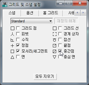 - 스냅 패널에서 모두 지우기를 클릭한 다음 정점, 모서리/세그먼트 및 중간점을 켭니다.