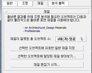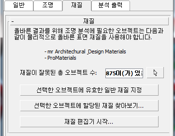 (오브젝트에서 재질 선택)을 사용하려는 경우 아무런 동작도 발생하지 않습니다. 조명 분석 길잡이에서는 재질이 할당되지 않은 오브젝트는 유효하지 않습니다.