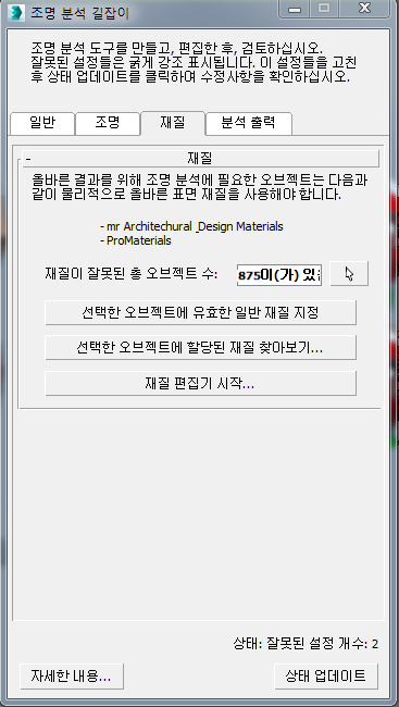 재질이 잘못된 총 오브젝트 수 상자는 현재 수정해야 하는 875개의 잘못된 오브젝트가 장면에 있음을 나타냅니다.