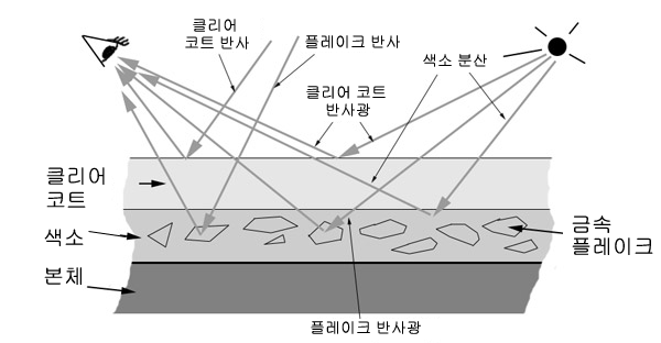 자동차 페인트에는 포함된 금속 조각, 클리어 코트 레이어 및 람베르트 먼지 레이어가 있는 페인트 레이어에 대한 구성요소가 있습니다.