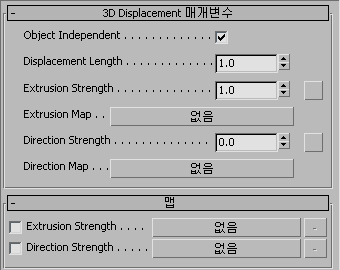 오브젝트 독립이 설정되어 있을 때 변위의 길이입니다. 돌출 맵은 100퍼센트(흰색)이고 돌출 강도는 1.0과 같습니다. 돌출 맵에서 회색 수준 또는 돌출 강도의 다른 값을 낮추거나 변위 양을 조정합니다. 오브젝트 독립이 꺼져 있을 때 이 값은 무시됩니다. 기본값은 1.0입니다.