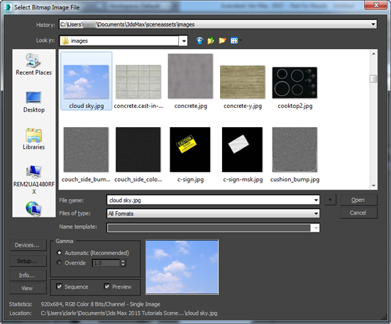 3ds Max에 비트맵 이미지 선택 대화상자가 열립니다.