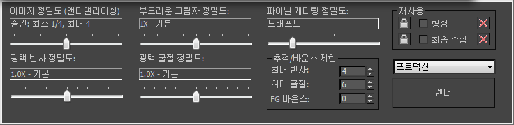 이 추가 패널은 mental ray가 활성 렌더러일 때 렌더된 프레임 창 아래에 나타납니다. 반사, 굴절, 파이널 게더링 등과 관련된 중요한 설정을 쉽게 조정할 수 있습니다.