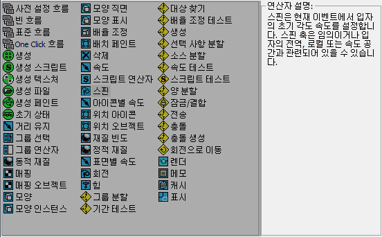 파티클 뷰에서 기지의 오른쪽에 있는 설명 패널은 기지에서 동작의 이름을 클릭하면 해당 텍스트 설명을 표시합니다. 기지 표시는 파티클 뷰 메뉴 명령 표시 설명으로 토글할 수 있습니다.