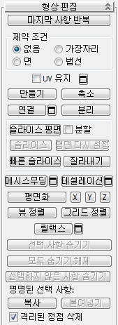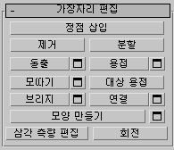 폴리 편집 가장자리 하위 수준 오브젝트에서 단일 및 다중 가장자리를 선택하고 표준 방법을 사용하여 변환할 수 있습니다. 이 항목에서는 형상 편집 및 가장자리 편집 롤아웃을 다루며 다른 컨트롤에 대한 내용은 폴리 편집 수정자를 참조하십시오.