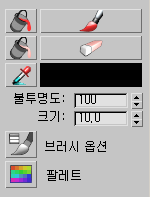 페인트브러시와 페인트에 액세스하게 해주는 컨트롤입니다. 색상 선택기 또는 장면에서 칠할 색상을 선택할 수 있습니다. 페인트브러시 크기나 외피를 조정하거나 고급 페인트브러시 옵션(예: 압력 민감도)을 시작하려면 선택합니다.