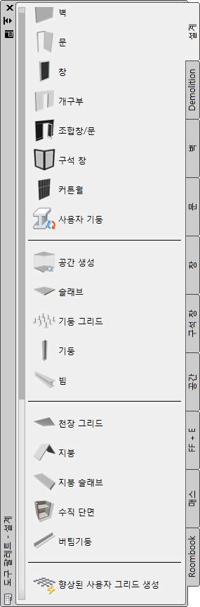 CAD 관리자에 의해 작성된 사용자 도구 팔레트 | 프로젝트 또는 사무용 표준에 맞게 CAD 관리자가 사용자화한 조합창/문 스타일 및 특성 |