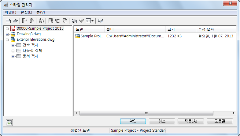 다음 과정에 따라 스타일 관리자에서 스타일 정렬 방법을 변경하십시오. 기본적으로 열린 도면 및 템플릿의 이름이 왼쪽 창의 트리 뷰에 표시됩니다. 트리 뷰에서 도면을 확장하면 도면 내의 각 스타일이 건축 객체, 문서 객체 및 다목적 객체의 세 가지 범주로 그룹화되어 있습니다. 범주를 확장하면 개별 스타일은 스타일 유형에 따라 알파벳 순으로 나열됩니다.