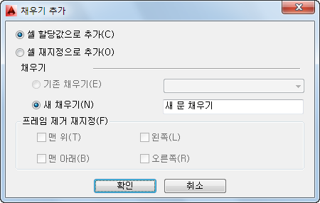 셀 재지정으로 추가를 선택하고 도면에 있는 스타일과 다른 스타일의 문, 창 또는 조합창/문을 삽입한 후 객체 주위의 프레임 모서리를 제거하지 않음 | 새 채우기를 선택하고 객체 이름을 입력한 후 확인을 클릭합니다. |