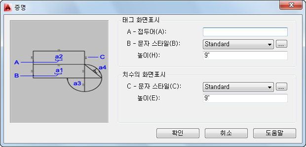다음 과정에 따라 공간 분해의 하위 도면요소에 대해 표시되는 태그 및 모서리 치수에 대한 문자 특성을 지정하십시오.