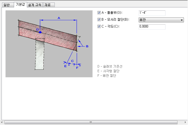 다음 과정에 따라 모서리 스타일을 사용하는 슬래브 또는 지붕 슬래브 모서리에 대한 기본 돌출부 깊이, 모서리 절단 및 모서리 각도를 지정하십시오.