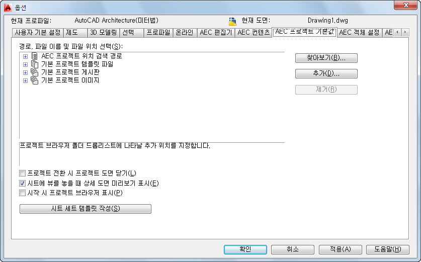 현재 도면에 대해 AEC 프로젝트 기본값 옵션 지정