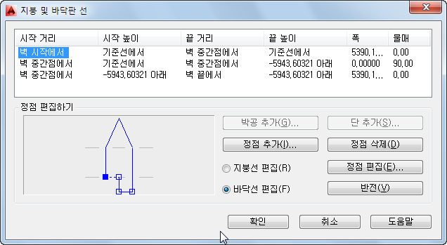 맨 위에 있는 표에는 커튼월의 각 정점에 대한 정보가 표시됩니다. 리스트에서 편집할 정점을 선택할 수 있습니다.
