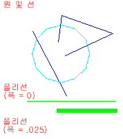 다음 그림에는 겹치는 선 및 다양한 폭의 폴리선이 있는 원이 표시되어 있습니다.