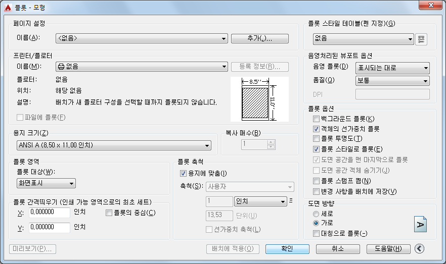 3. 용지 크기, 플롯 영역, 플롯 축척, 방향 및 기타 옵션을 선택합니다.