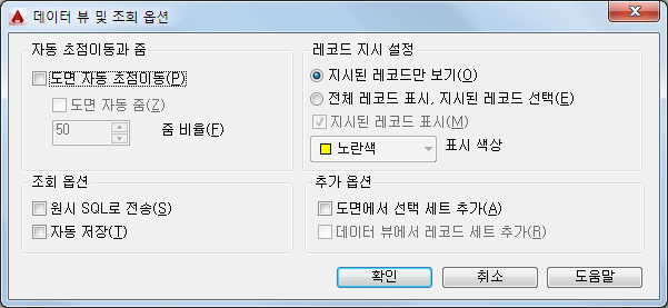 현재 도면에서 해당 객체를 선택할 때 데이터 뷰 윈도우에 나타나는 링크된 레코드의 모양을 조정합니다.