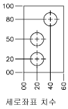세로좌표 치수는 지시선과 함께 X 또는 Y 값으로 구성됩니다. X-데이텀 세로좌표 치수는 데이텀으로부터 X축을 따라 피쳐의 거리를 측정합니다. Y-데이텀 세로좌표 치수는 Y 축을 따라 거리를 측정합니다.