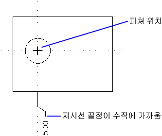 피쳐 위치를 지정하면 지시선 끝점을 입력하라는 프롬프트가 표시됩니다. 기본적으로, 지정한 지시선 끝점은 자동으로 X- 또는 Y-데이텀 세로좌표 치수의 작성 여부를 결정합니다. 예를 들어, 수평보다 수직에 가까운 지시선 끝점에 대한 위치를 지정하여 X-데이텀 세로좌표 치수를 작성할 수 있습니다.