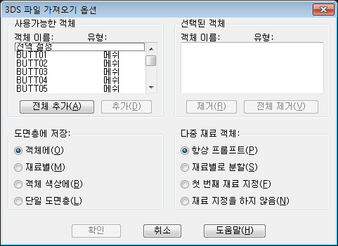 지정된 3D Studio(3DS) 파일에 있는 모든 객체의 이름을 표시합니다. 최대 70개의 객체를 선택할 수 있습니다.