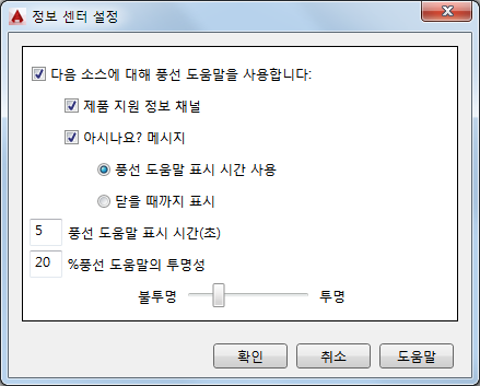 응용프로그램 윈도우 오른쪽 위 구석에 표시되는 풍선 도움말의 컨텐츠와 표시 시간을 조정하는 옵션을 제공합니다.
