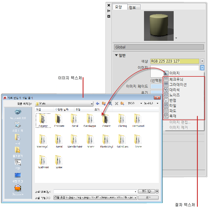 이 제품은 텍스처에 사용할 수 있는 이미지 라이브러리를 제공합니다. 또한 다음 파일 유형을 사용하여 자신만의 텍스처를 추가할 수도 있습니다.