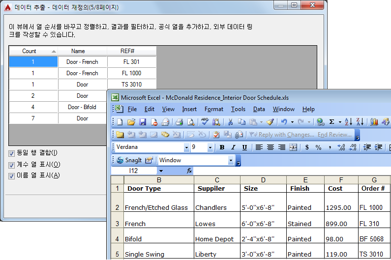 Excel 스프레드시트에 저장한 정보를 추출한 도면 데이터(객체 특성 데이터)와 링크하여 결합할 수 있습니다. 위의 예제를 계속 살펴보겠습니다. 도면의 출입구에 대한 일부 추가 정보(공급자 및 비용)가 Excel 스프레드시트에 들어 있다고 가정합니다. 이 경우 스프레드시트에서 공급자 및 비용에 대한 열을 선택하고 이들 열을 데이터 추출의 다른 데이터와 결합합니다.