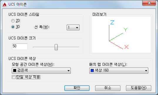 2D 또는 3D UCS 아이콘의 표시와 그 모양을 지정합니다.
