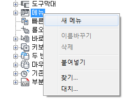 사용자화 탭에 있는 <파일 이름>의 사용자화 창에서 메뉴 노드를 마우스 오른쪽 버튼으로 클릭합니다. 새 메뉴를 클릭합니다.