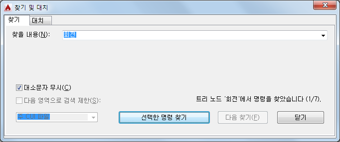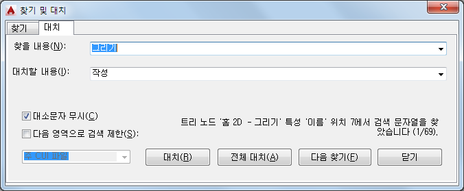 명령의 위치에 대해 상세히 설명하는 메시지가 표시됩니다. 즉, 사용자화 또는 특성 창에서의 정확한 위치 및 명령을 찾은 횟수가 표시됩니다.