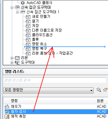 3. 신속 접근 도구막대에 추가할 명령 또는 컨트롤을 명령 리스트 창에서 <파일 이름>의 사용자화 창으로 끕니다.