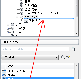 6. 드롭다운 메뉴에 추가할 명령 또는 컨트롤을 명령 리스트 창에서 <파일 이름>의 사용자화 창으로 끕니다.