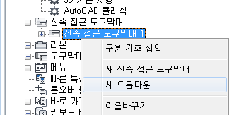 1. 사용자화 탭에 있는 <파일 이름>의 사용자화 창에서 신속 접근 도구막대 노드를 마우스 오른쪽 버튼으로 클릭합니다. 새 신속 접근 도구막대를 클릭합니다.