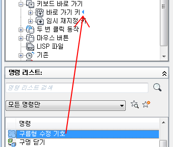 - 바로 가기 키를 작성하려면 명령 리스트 창에서 <파일 이름>의 사용자화 창의 바로 가기 키 노드로 명령을 끌어옵니다.