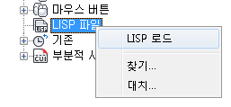 2. 사용자화 탭에 있는 <파일 이름>의 사용자화 창에서 LISP 파일 노드를 마우스 오른쪽 버튼으로 클릭합니다. LISP 로드를 클릭합니다.