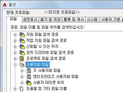 2. 옵션 대화상자의 파일 탭에서 사용자화 파일 옆에 있는 더하기 기호(+)를 클릭하여 노드를 확장합니다.