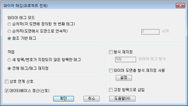 순차적인 와이어 번호나 와이어 네트워크의 선 연계 시작 위치에 기반한 와이어 번호를 사용하여 와이어를 처리하고 태깅할 수 있습니다. 와이어 번호가 도면에 자동으로 삽입될 때는 번호가 중복되지 않습니다.